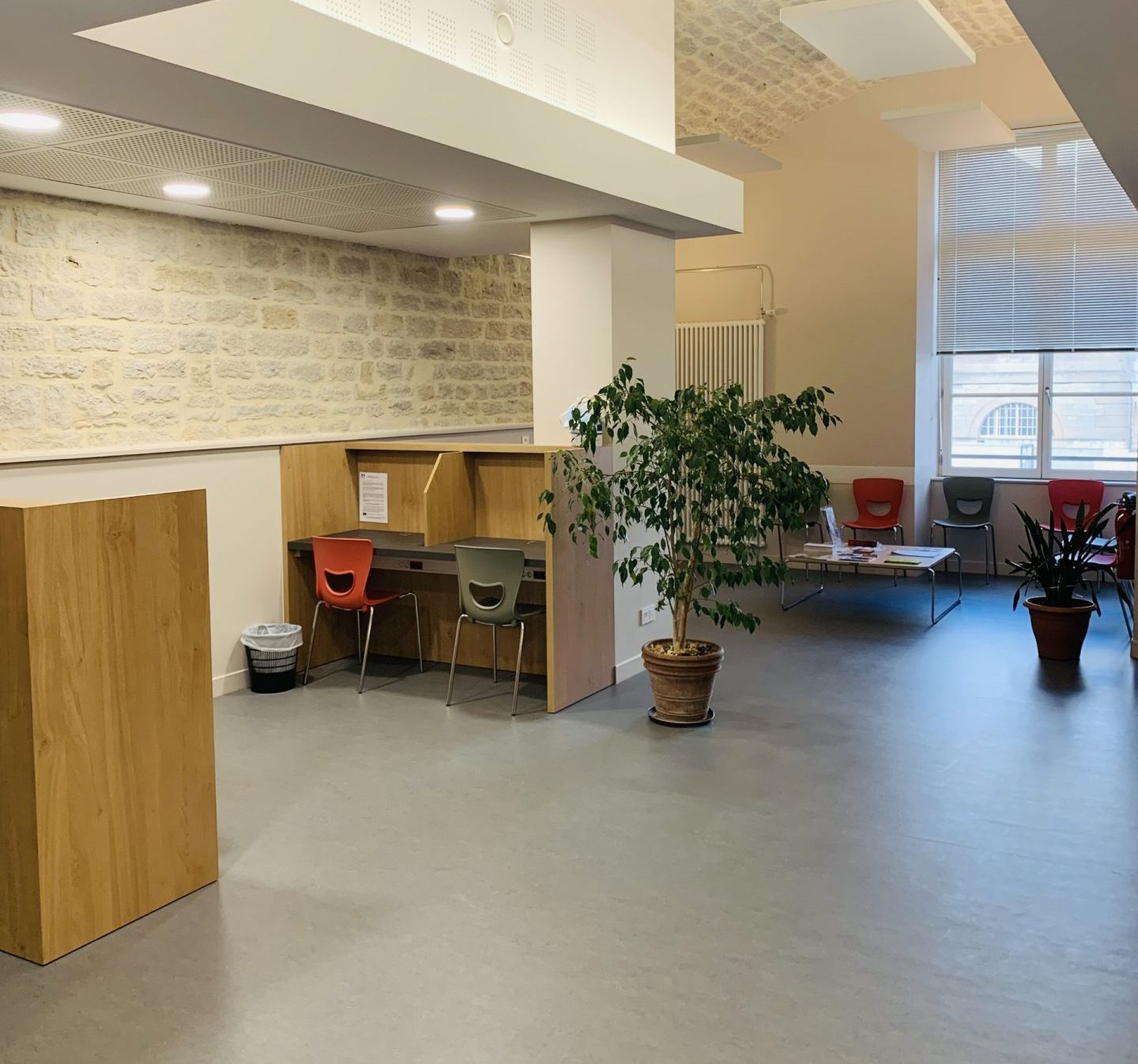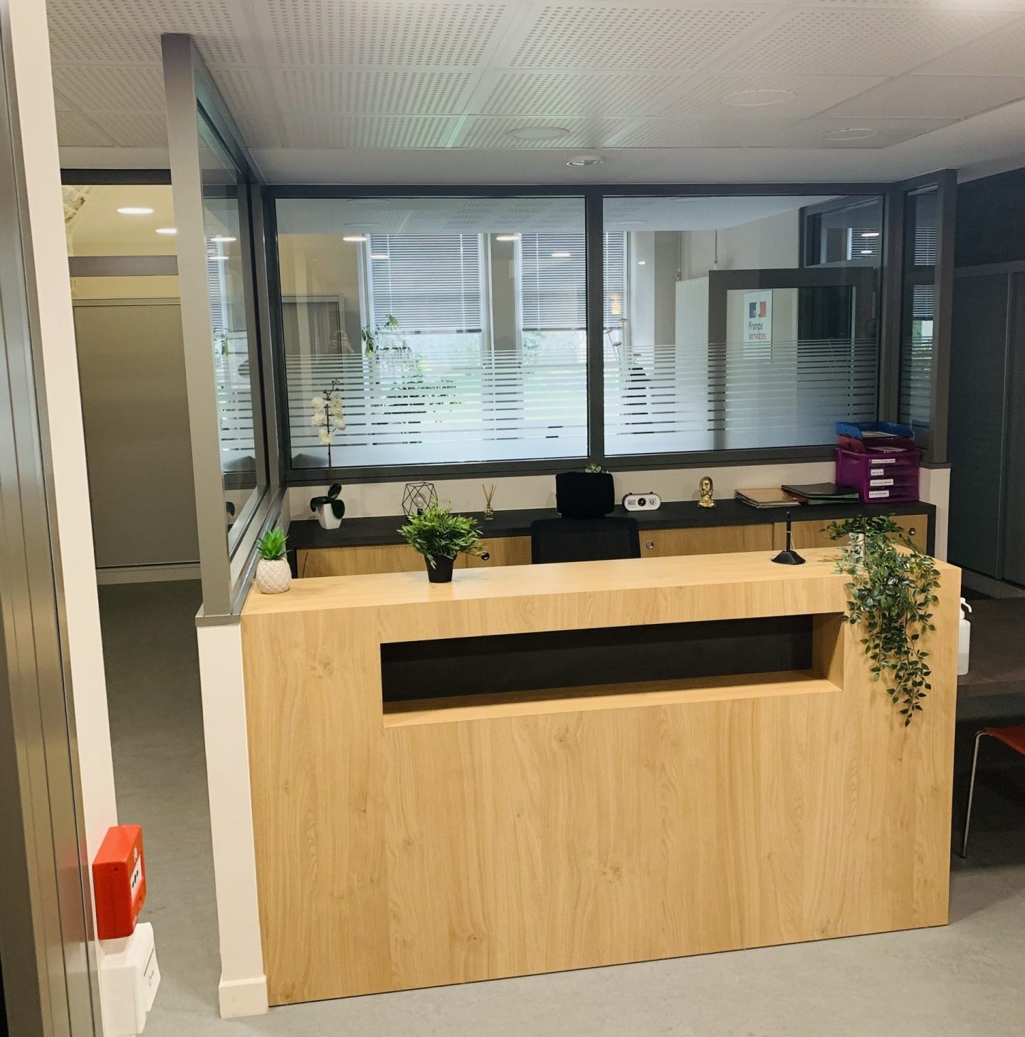 Aménagement de bureaux collectifs avec banque d’accueil, bancs, placards etc.