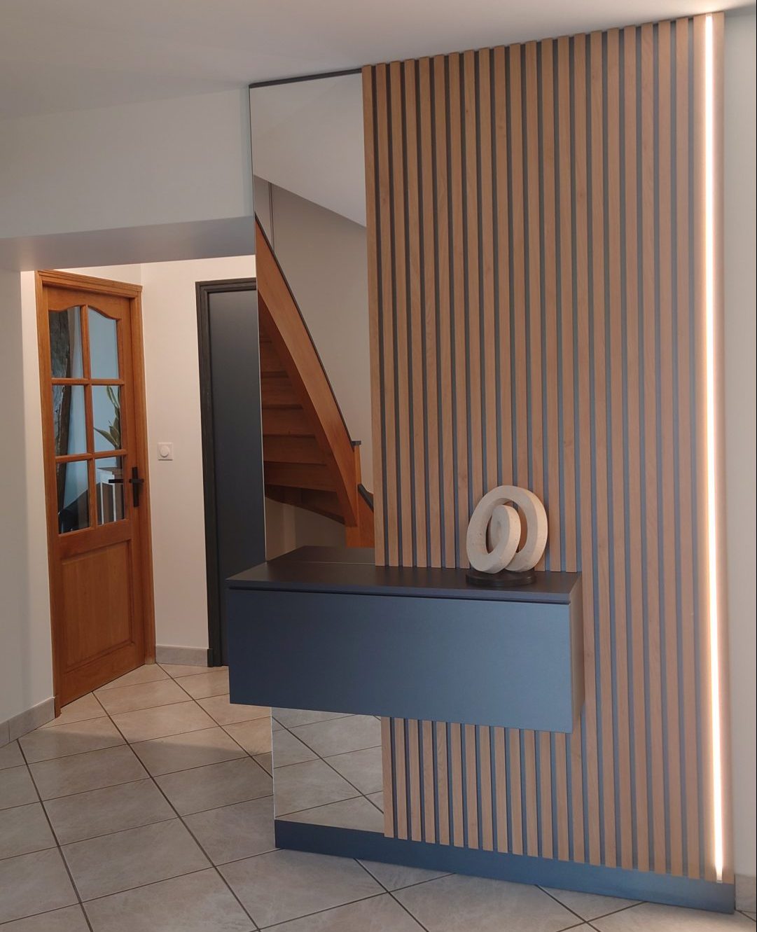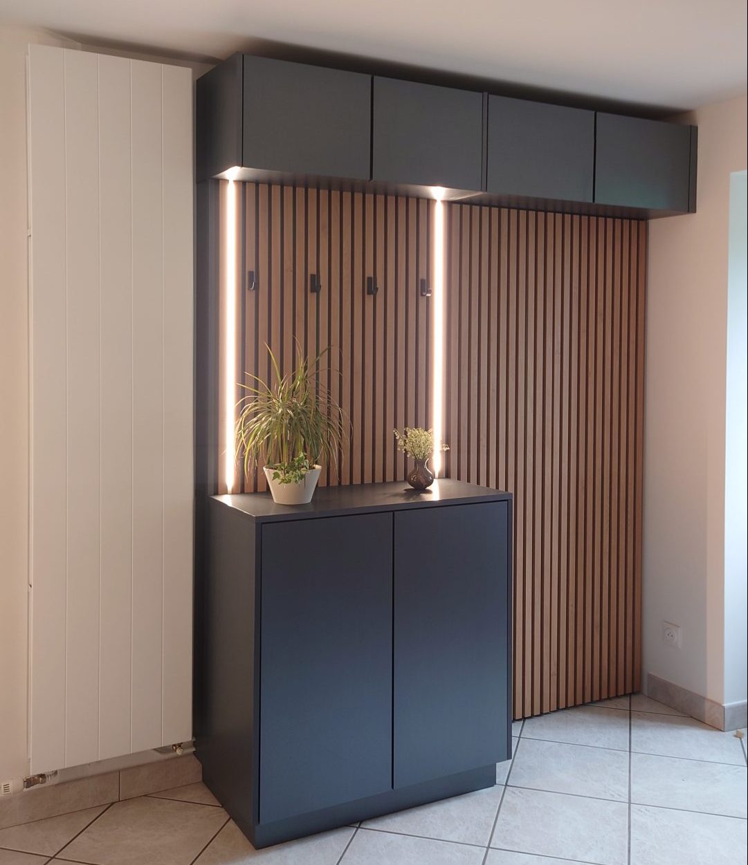 Aménagement complet d’une entrée avec placard, banc, console et buffet dans le salon
