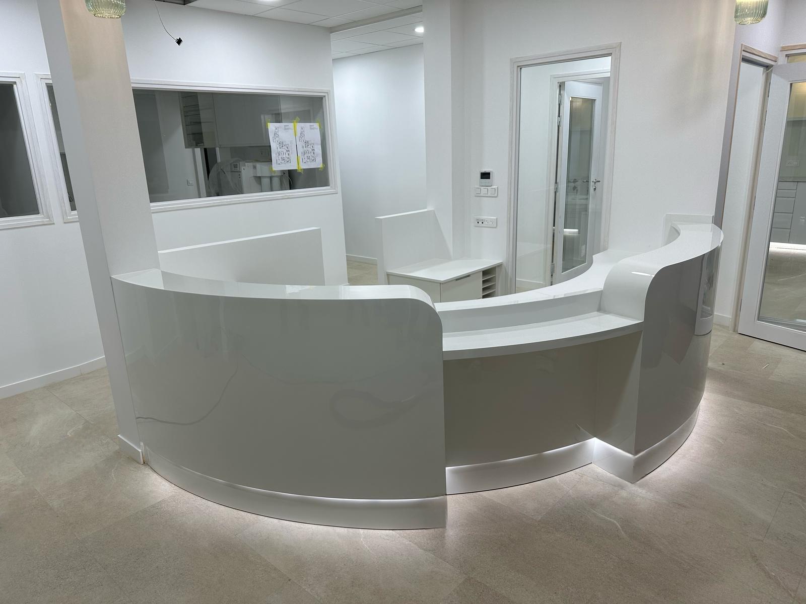 Conception d’une banque d’accueil tout en arrondis en finition blanc brillant