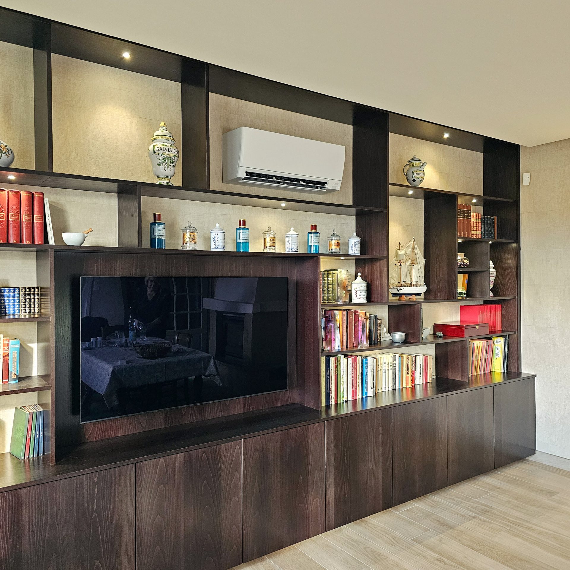 Bibliothèque avec intégration d’un espace télévision et du climatiseur