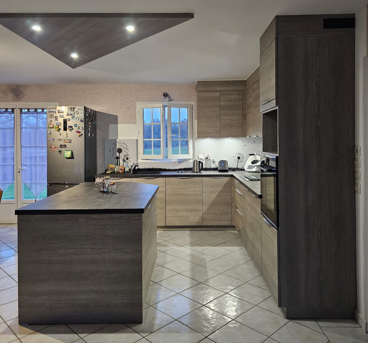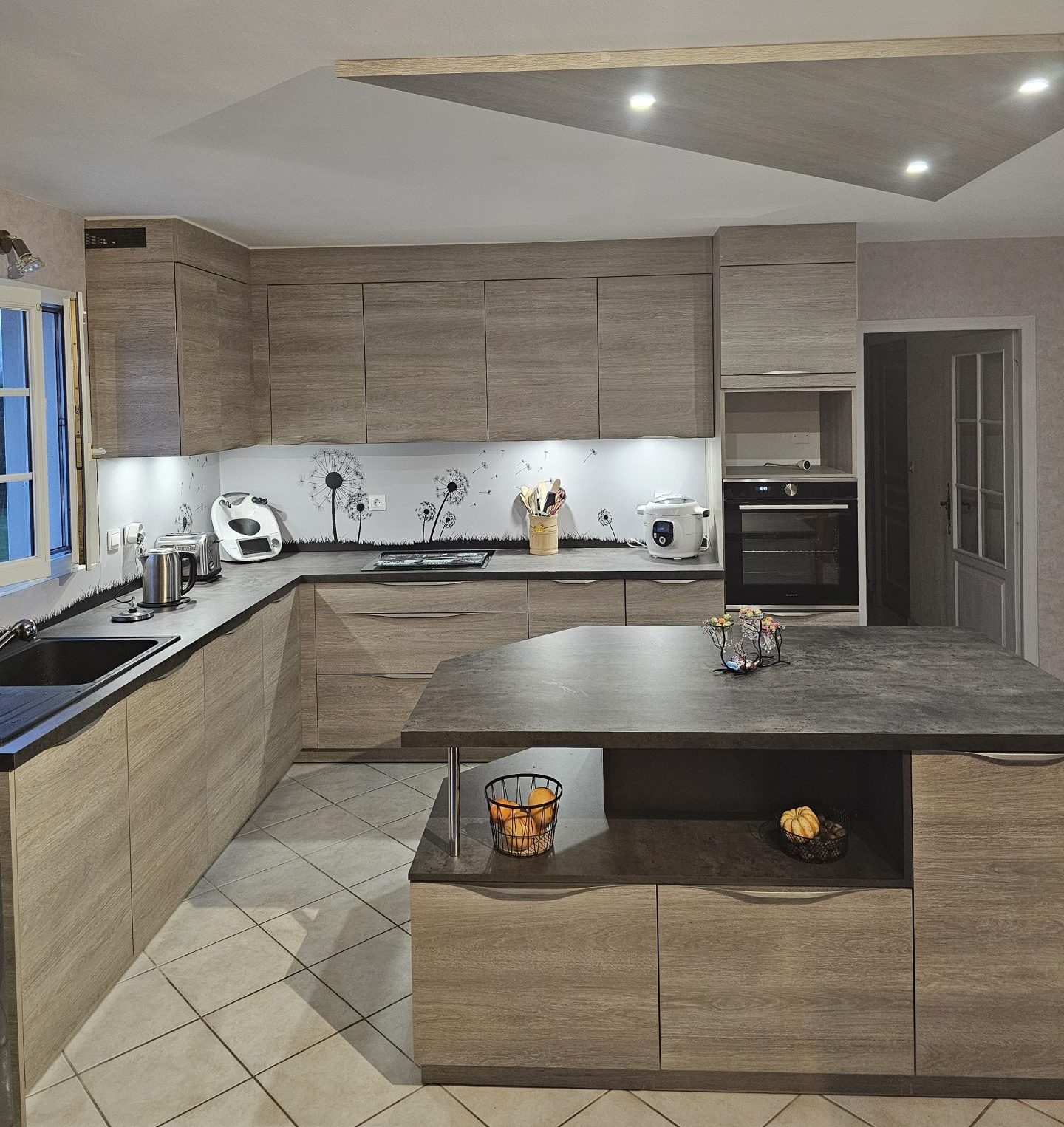 Cuisine ton chêne gris et plan de travail ardoise, crédence imprimée