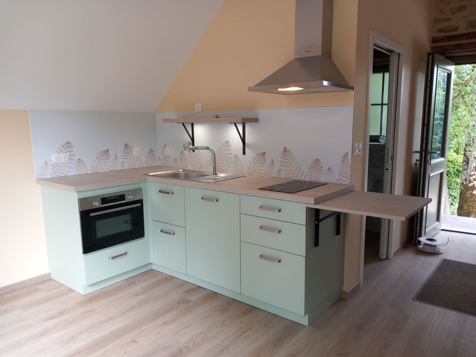 Petit cuisine fonctionnelle avec table rabattable, dans des tons pastels