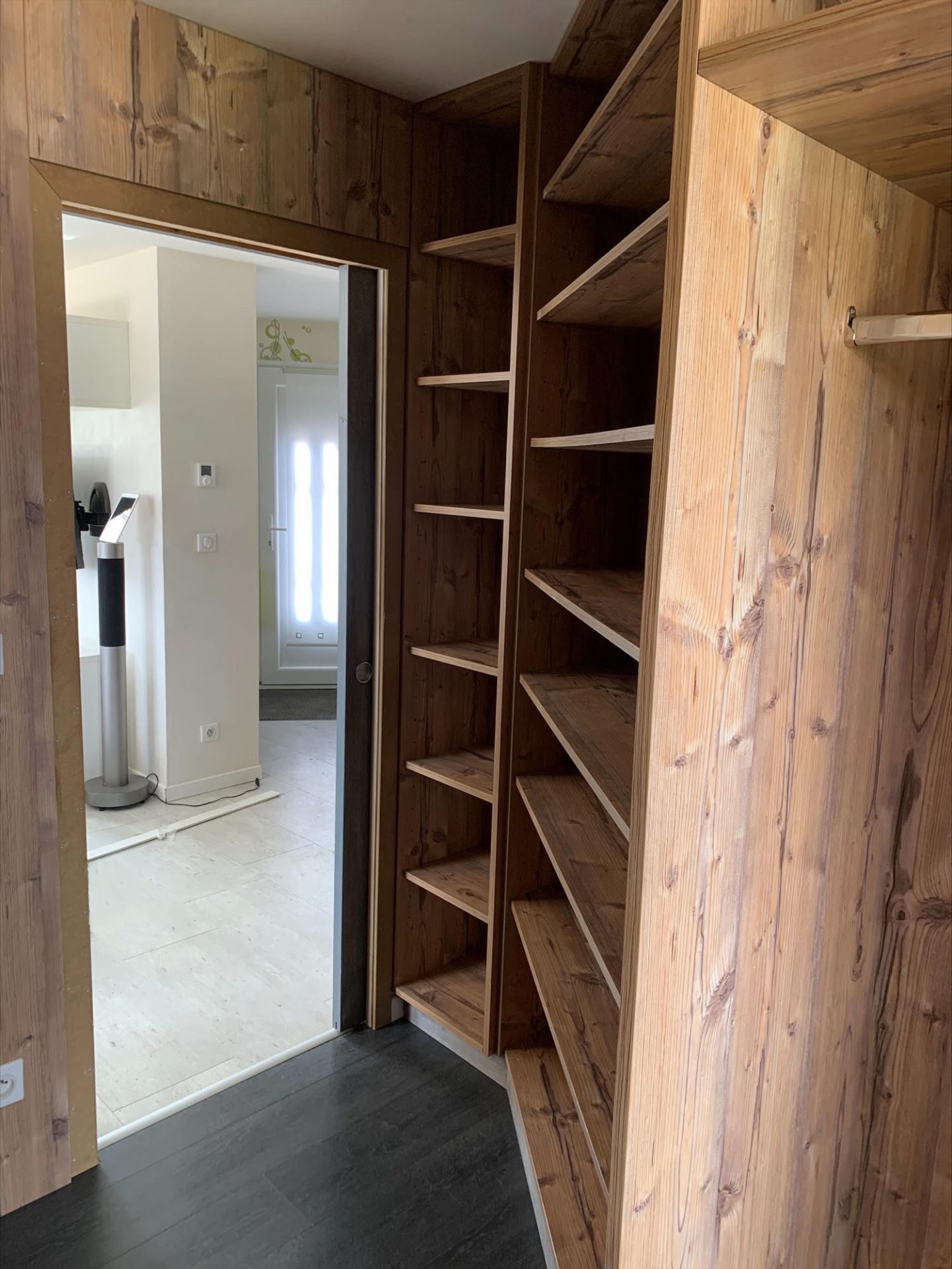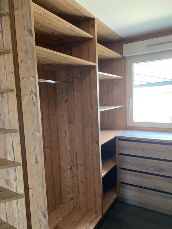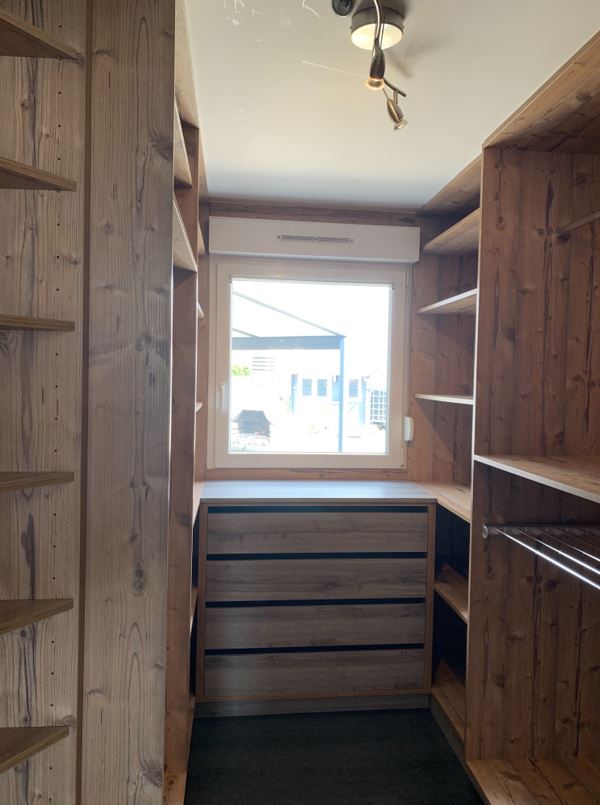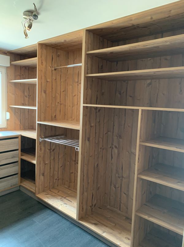 Dressing tout en mélaminé ton bois avec habillage des murs
