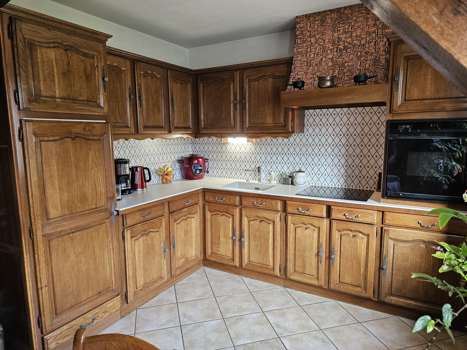 Plan de travail en quartz et crédence imprimée pour un changement de look sur cette cuisine existante en chêne